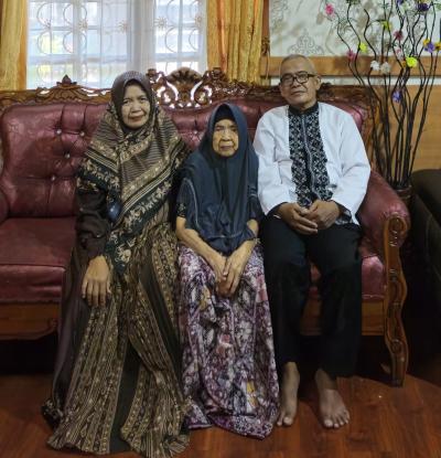 Foto Hj.Hadaria bersama dua org anaknya, Ruslang T dan Hj.Rostina, di rumah Hj.Rostina, tgl 31 Maret 2025, bertepatan Hari Raya Idul Fitri 1446 H